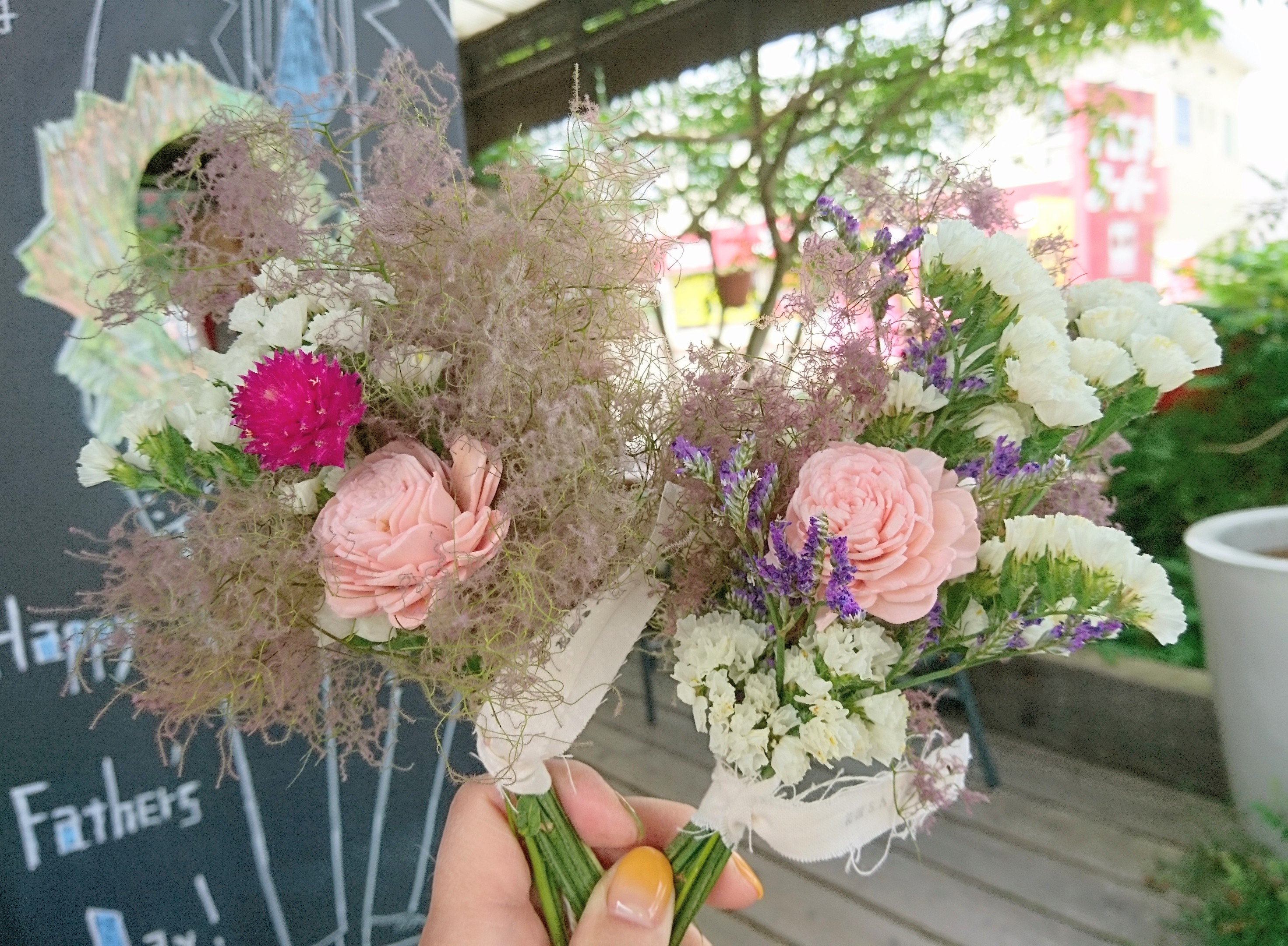 くすみ系のアンティークな雰囲気の色した、モフモフした植物は、スモークツリーを使用しています。