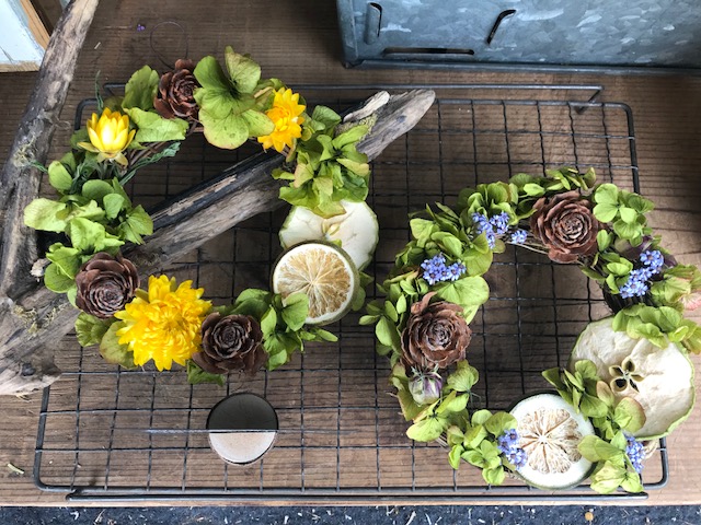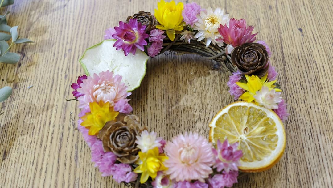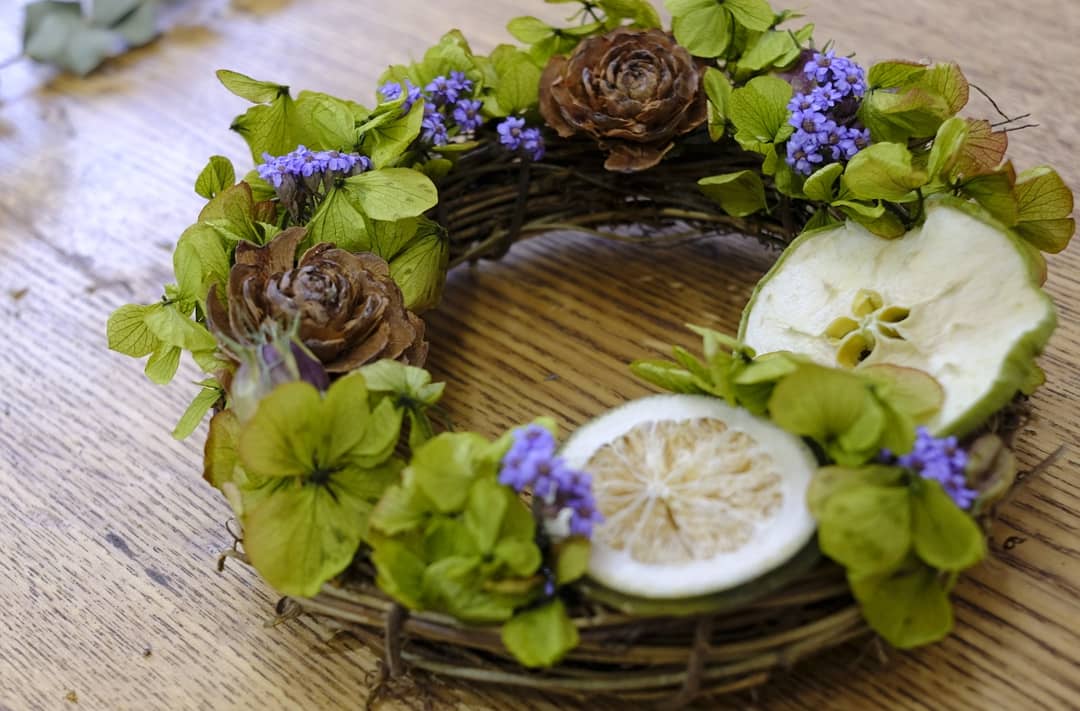 壁掛けや、棚に置いたり、飾る場所を探すのが楽しくなるリース。