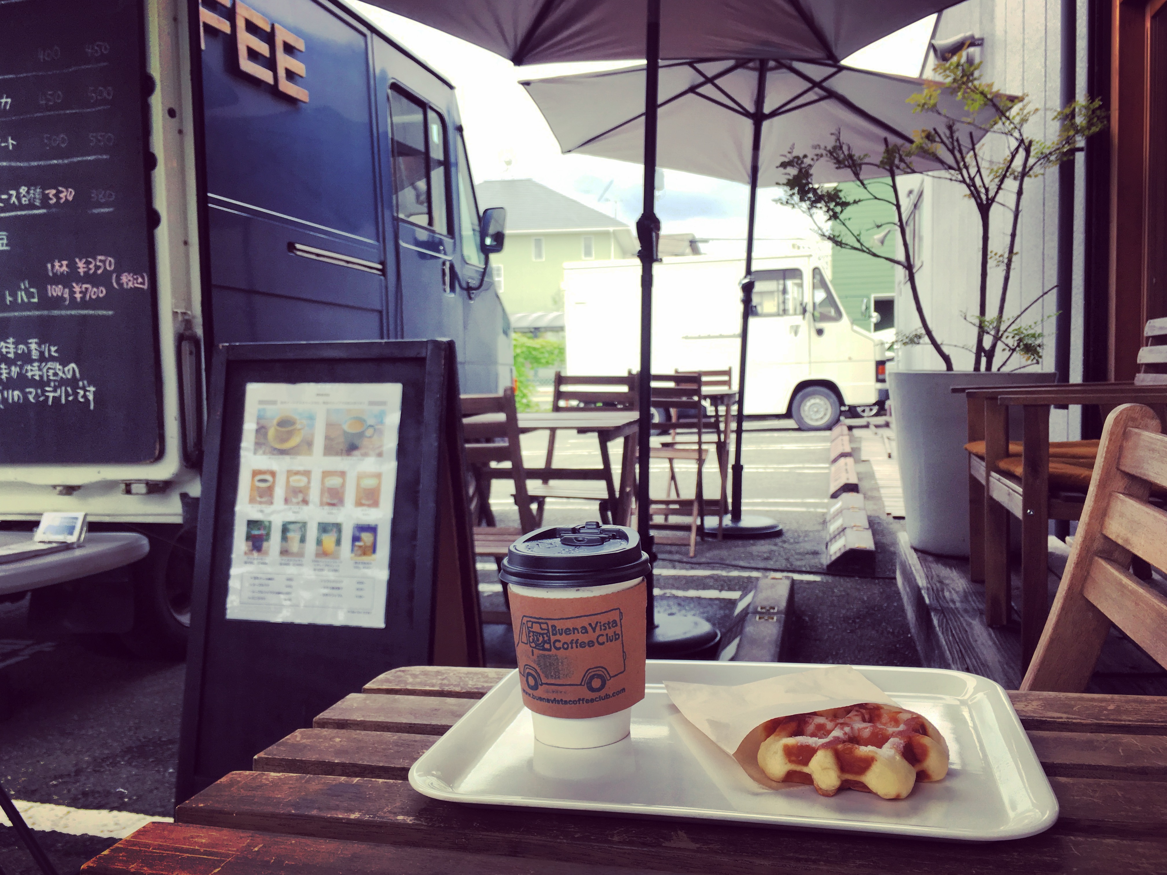 本日のコーヒーはモカ有機 ベルギーワッフルも販売中です。