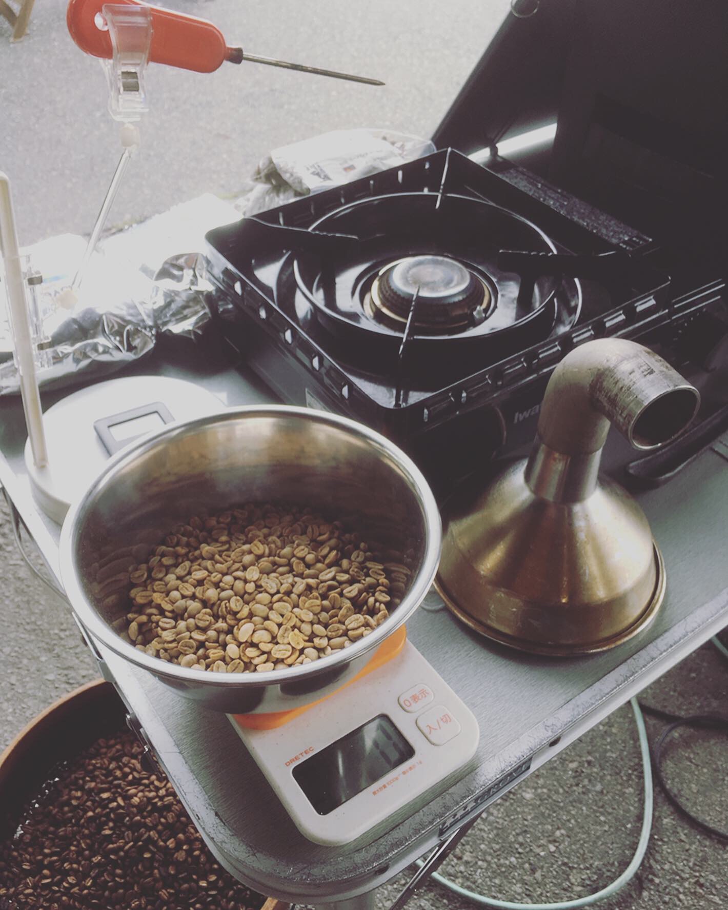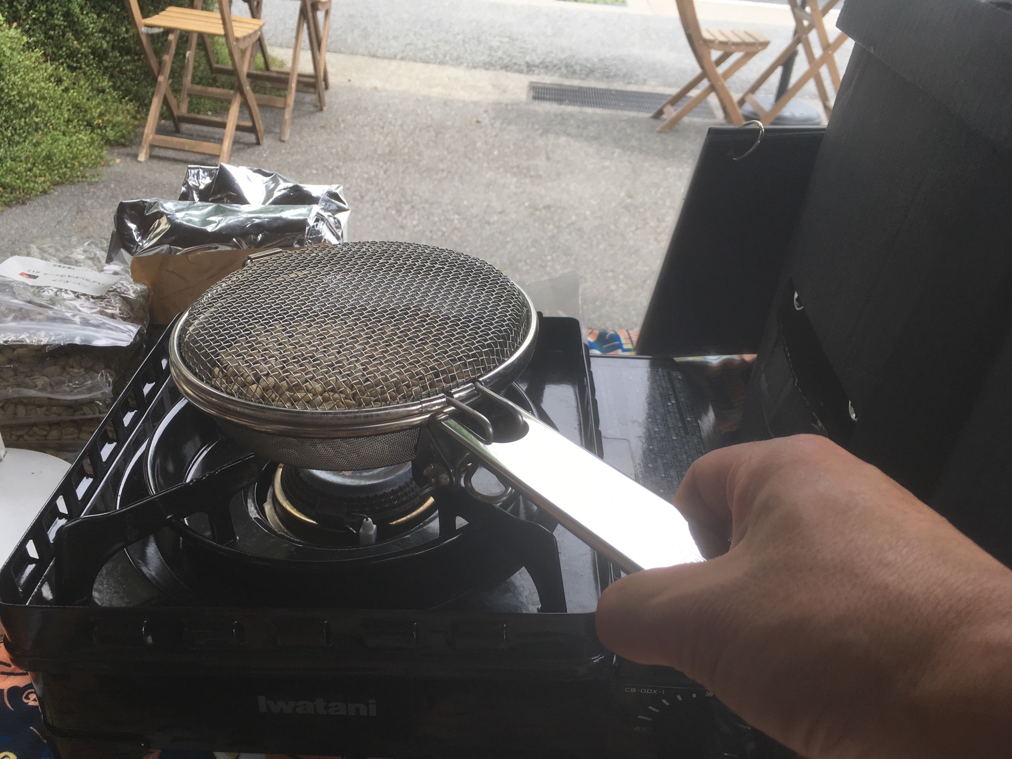 手編み焙煎の実演しております。